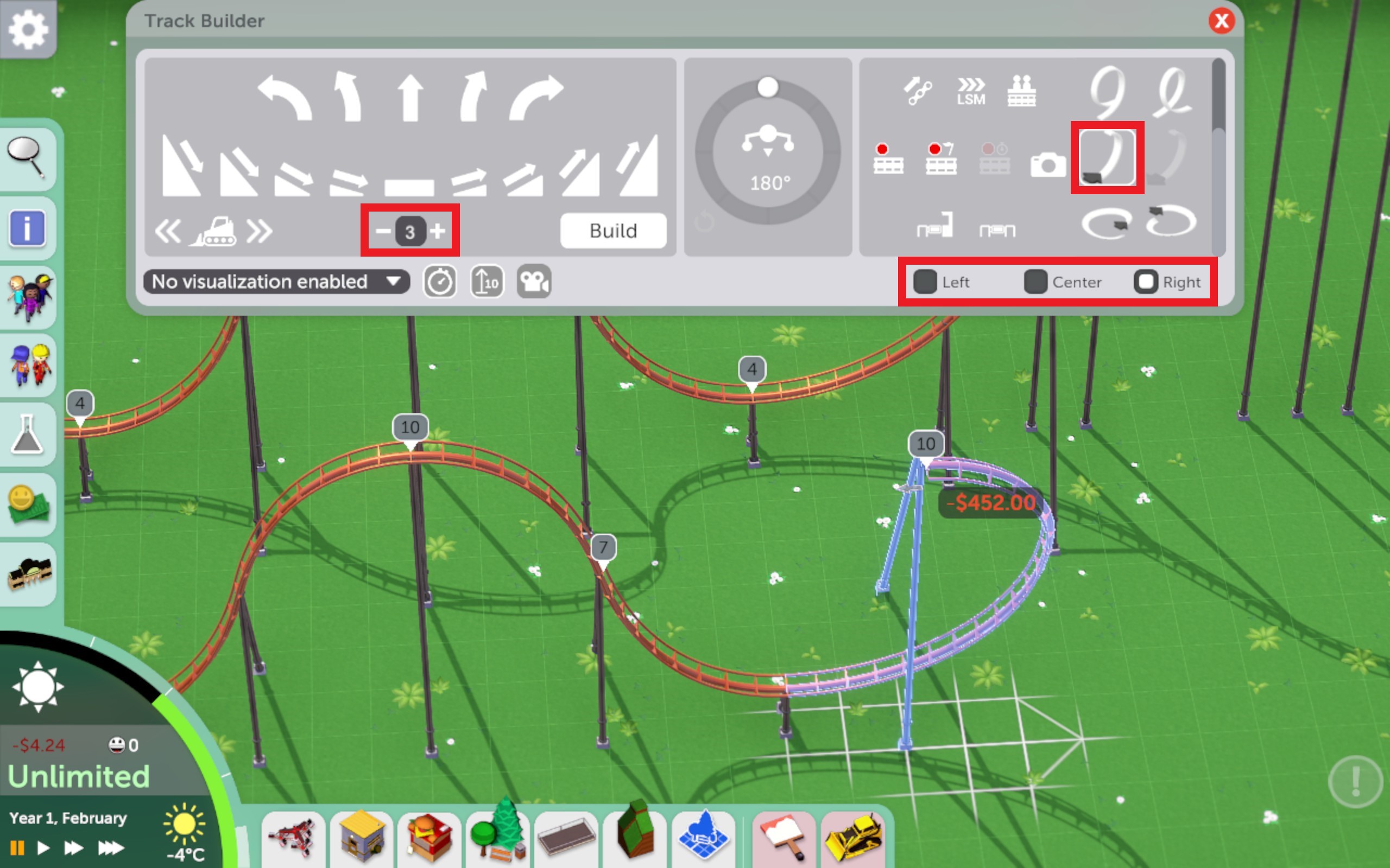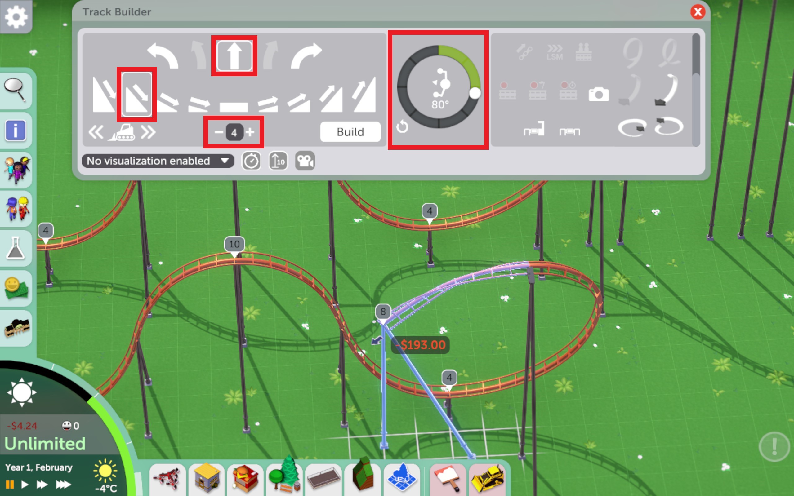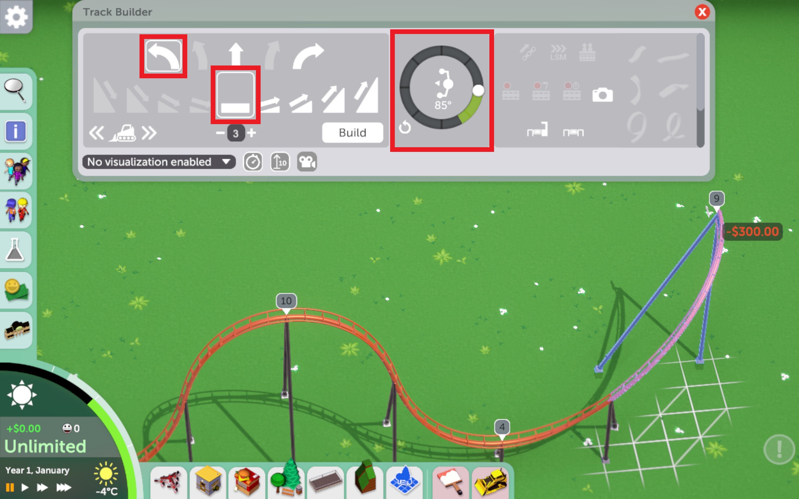 최대 상승/하강 경사, 최대 뱅킹각도, 사용가능한 특수트랙의 종류 등이 롤러코스터 기종별로 다르기 때문에, 트랙 건설 창 역시 기종에 따라 다르게 보일 수 있습니다. 추가적으로 왼쪽 아래의 불도저 모양 아이콘은 이전 트랙을 취소하는 것이고, 오른쪽의 사진기 모양 아이콘은 탑승 사진 섹션을 위한 것입니다.