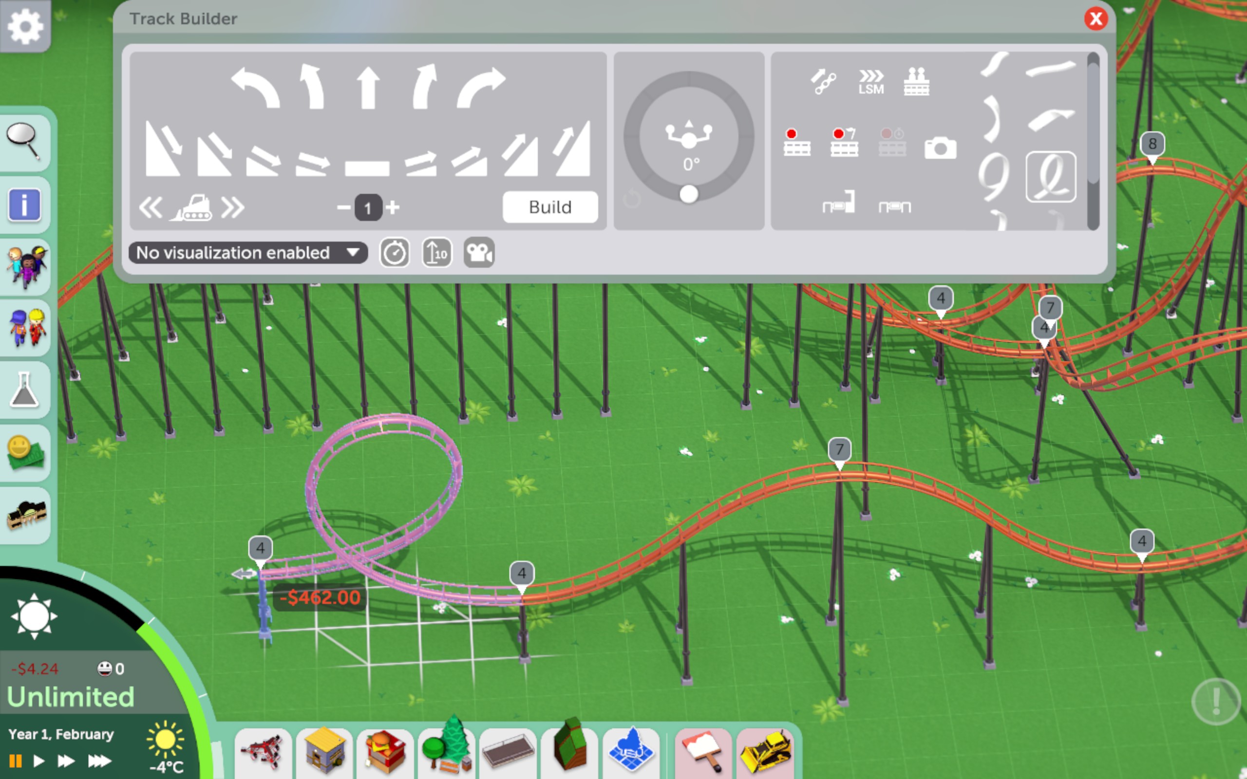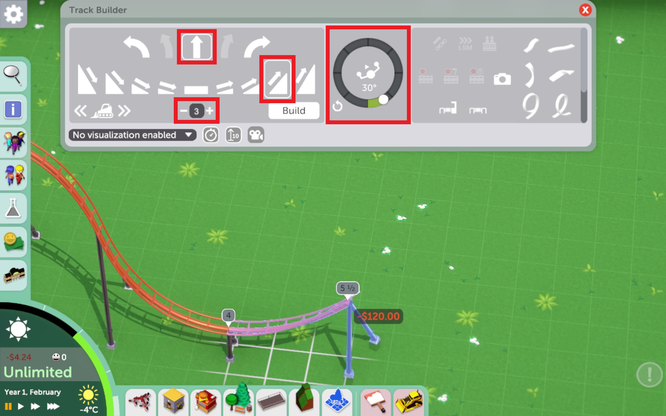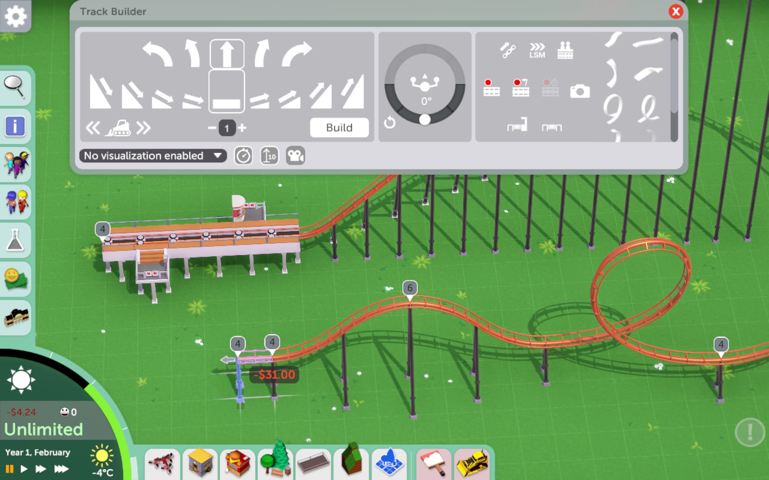 최대 상승/하강 경사, 최대 뱅킹각도, 사용가능한 특수트랙의 종류 등이 롤러코스터 기종별로 다르기 때문에, 트랙 건설 창 역시 기종에 따라 다르게 보일 수 있습니다. 추가적으로 왼쪽 아래의 불도저 모양 아이콘은 이전 트랙을 취소하는 것이고, 오른쪽의 사진기 모양 아이콘은 탑승 사진 섹션을 위한 것입니다.