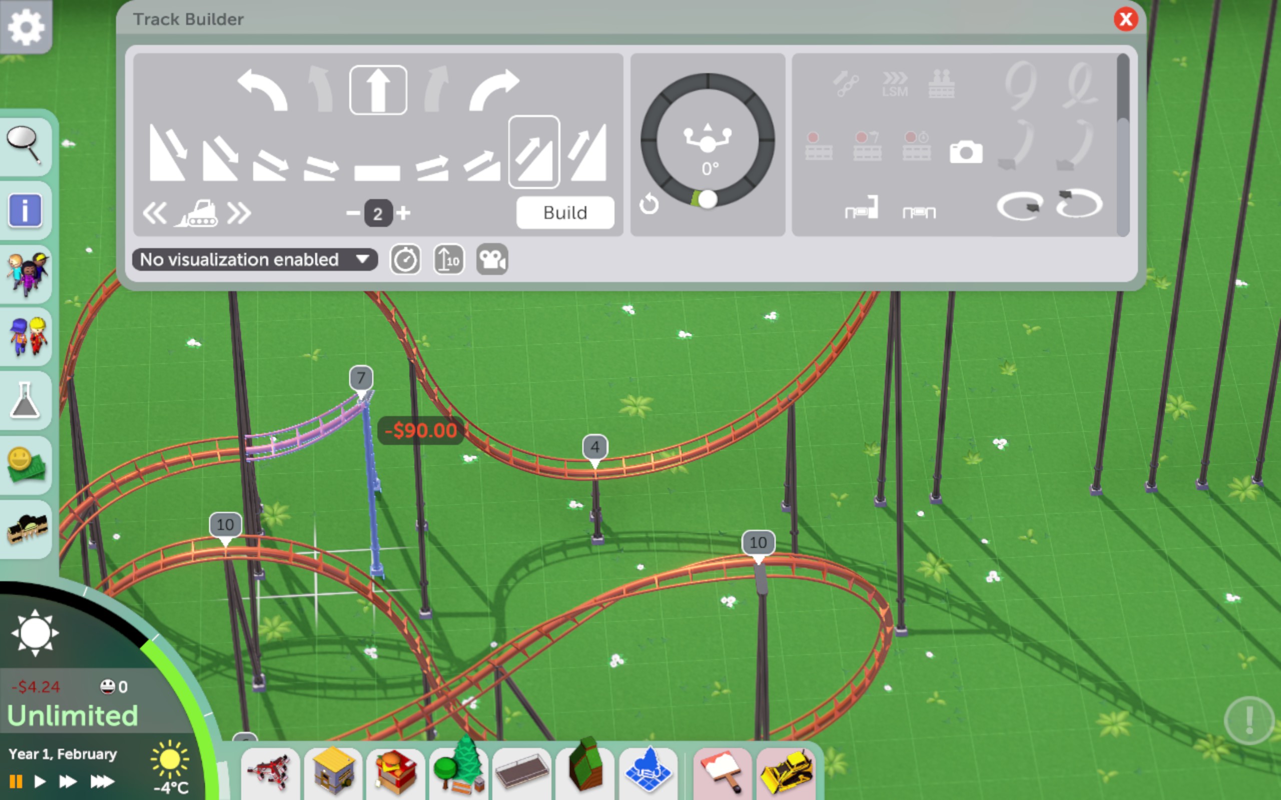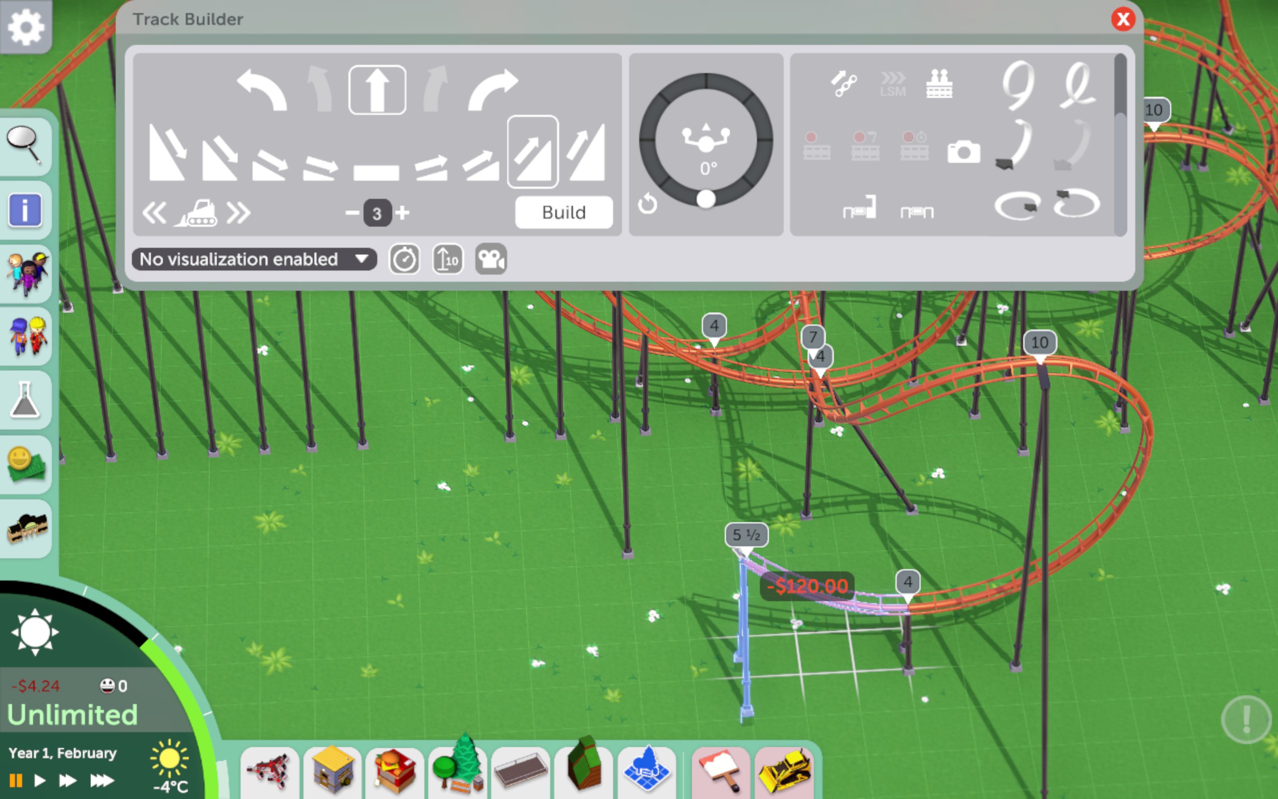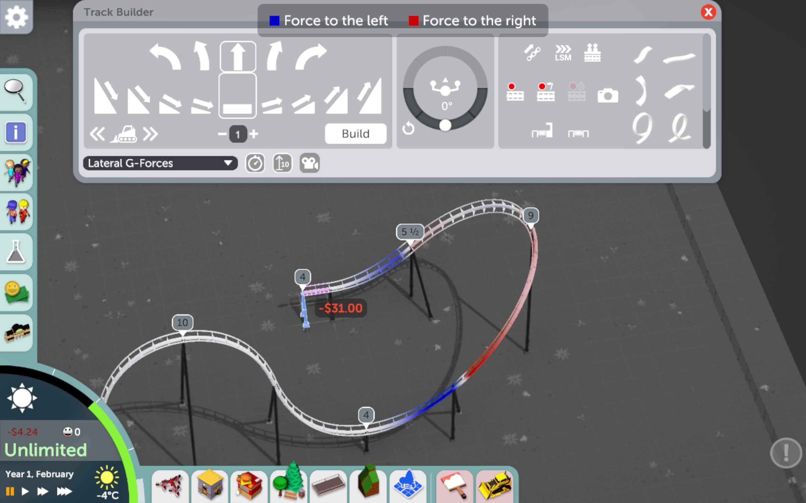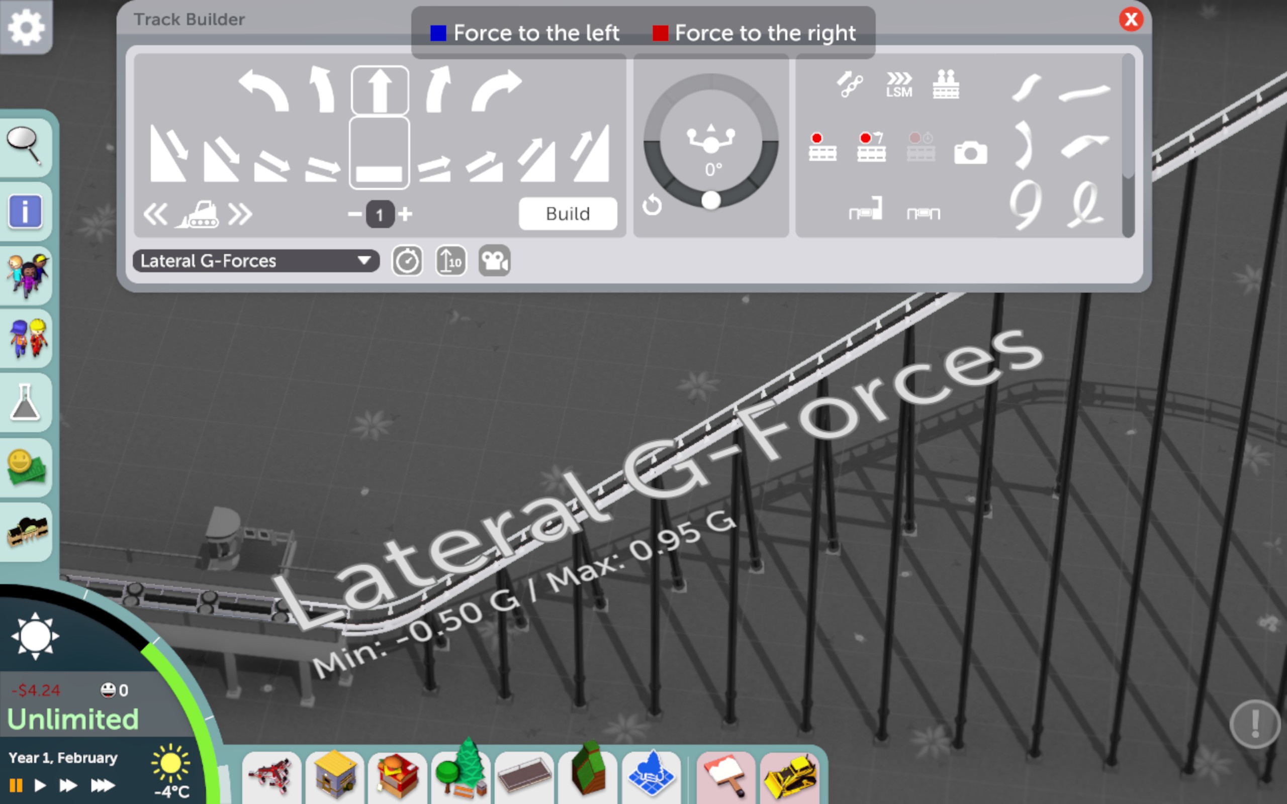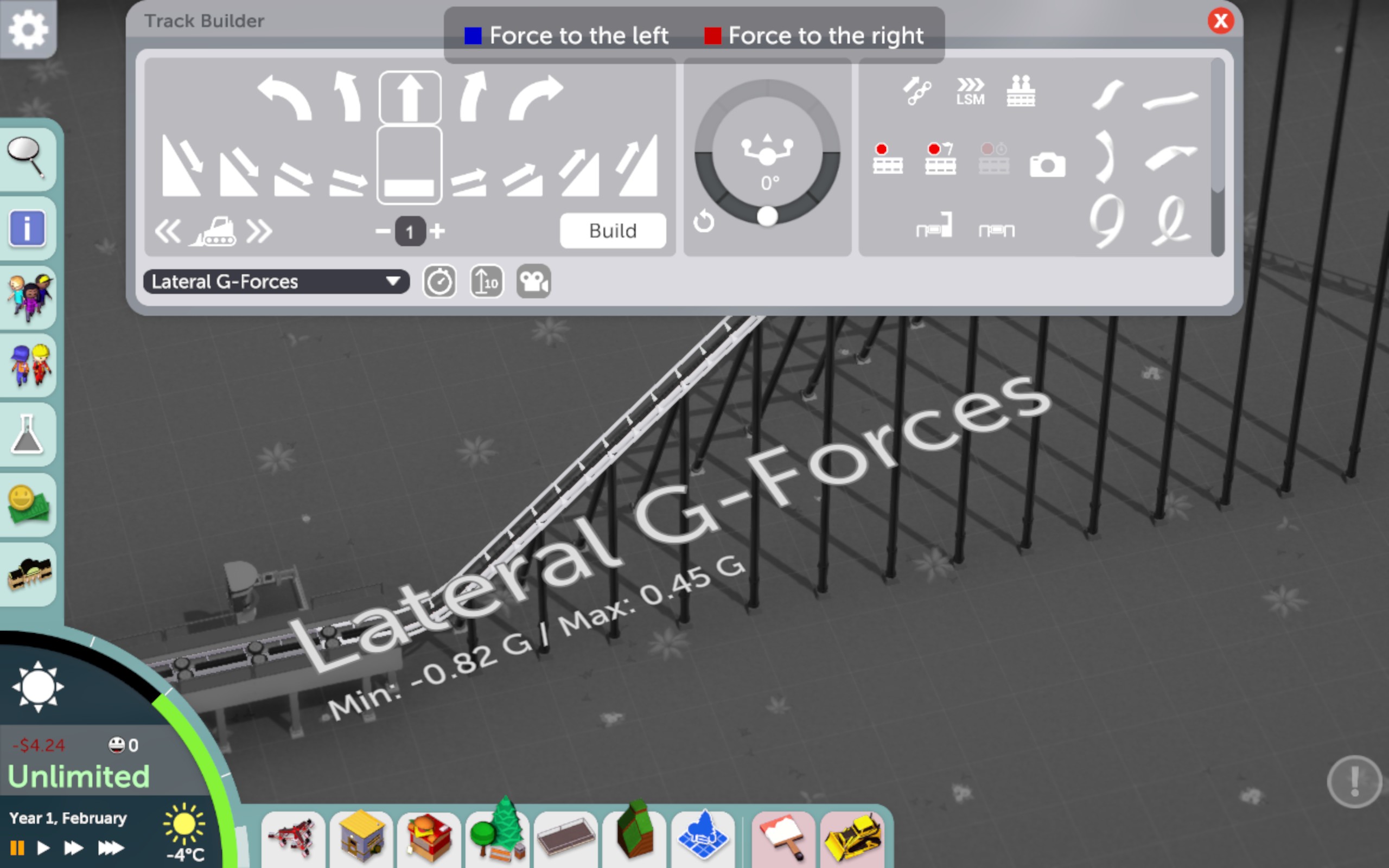 트랙을 기울이는 뱅킹을 적용하기 위해서는 트랙 제작 창의 뱅킹 옵션에서 작은 흰색 원을 원하는 각도로 드래그하면 됩니다. 롤러코스터 타이쿤 시리즈와는 다르게 5도 단위로 뱅킹을 적용할 수 있기 때문에, 측면 가속도를 컨트롤하기가 쉬울 뿐 아니라 트랙을 더 다채롭게 만들 수 있다는 장점도 있습니다.