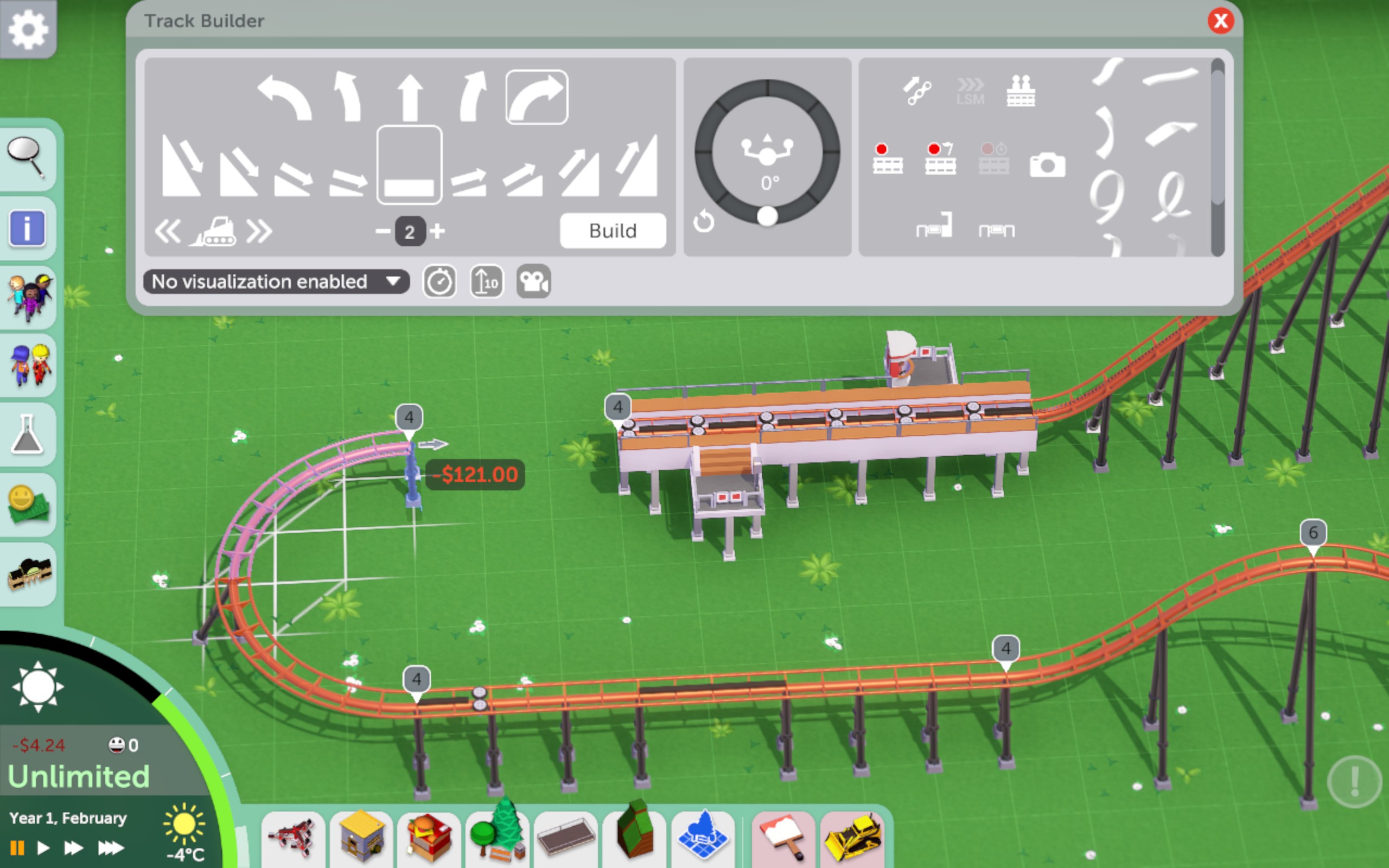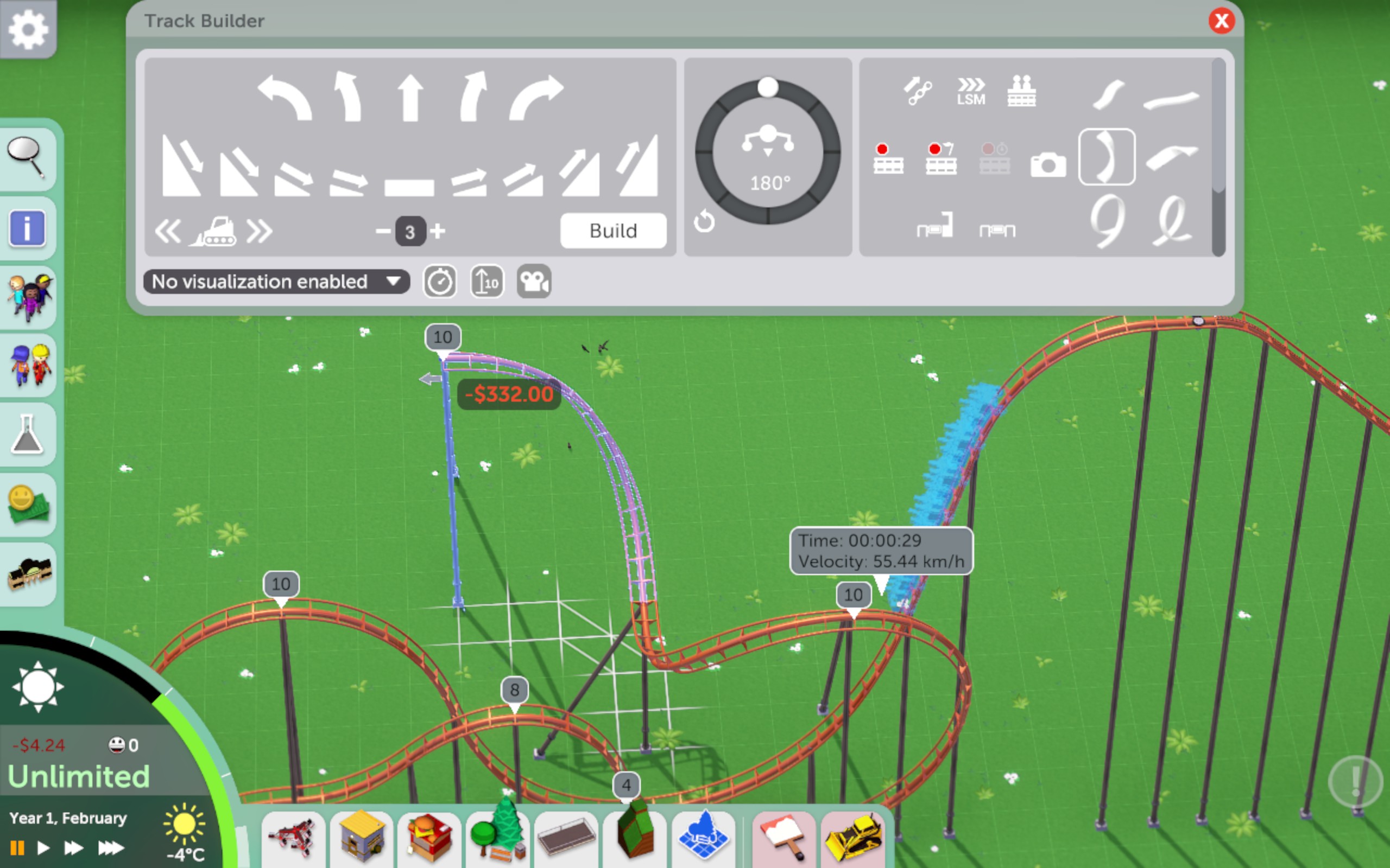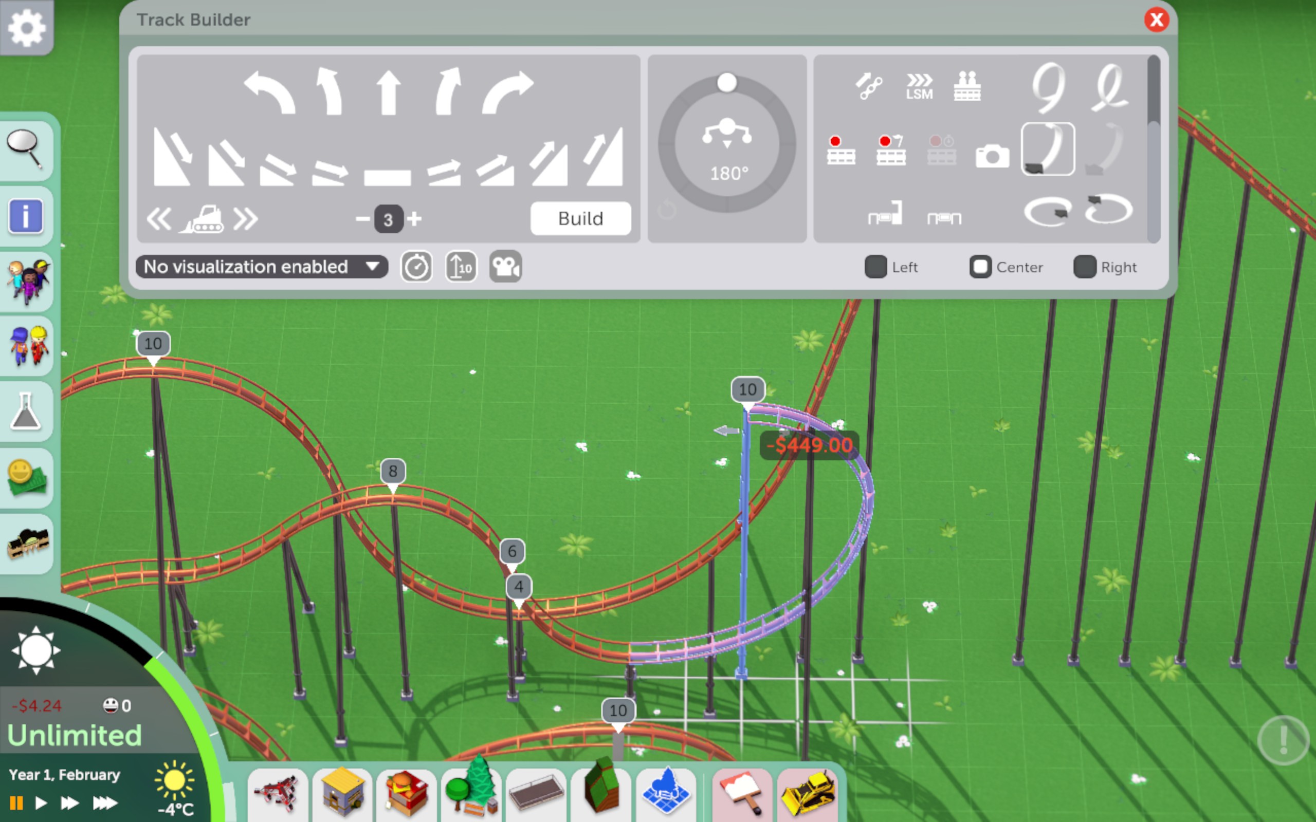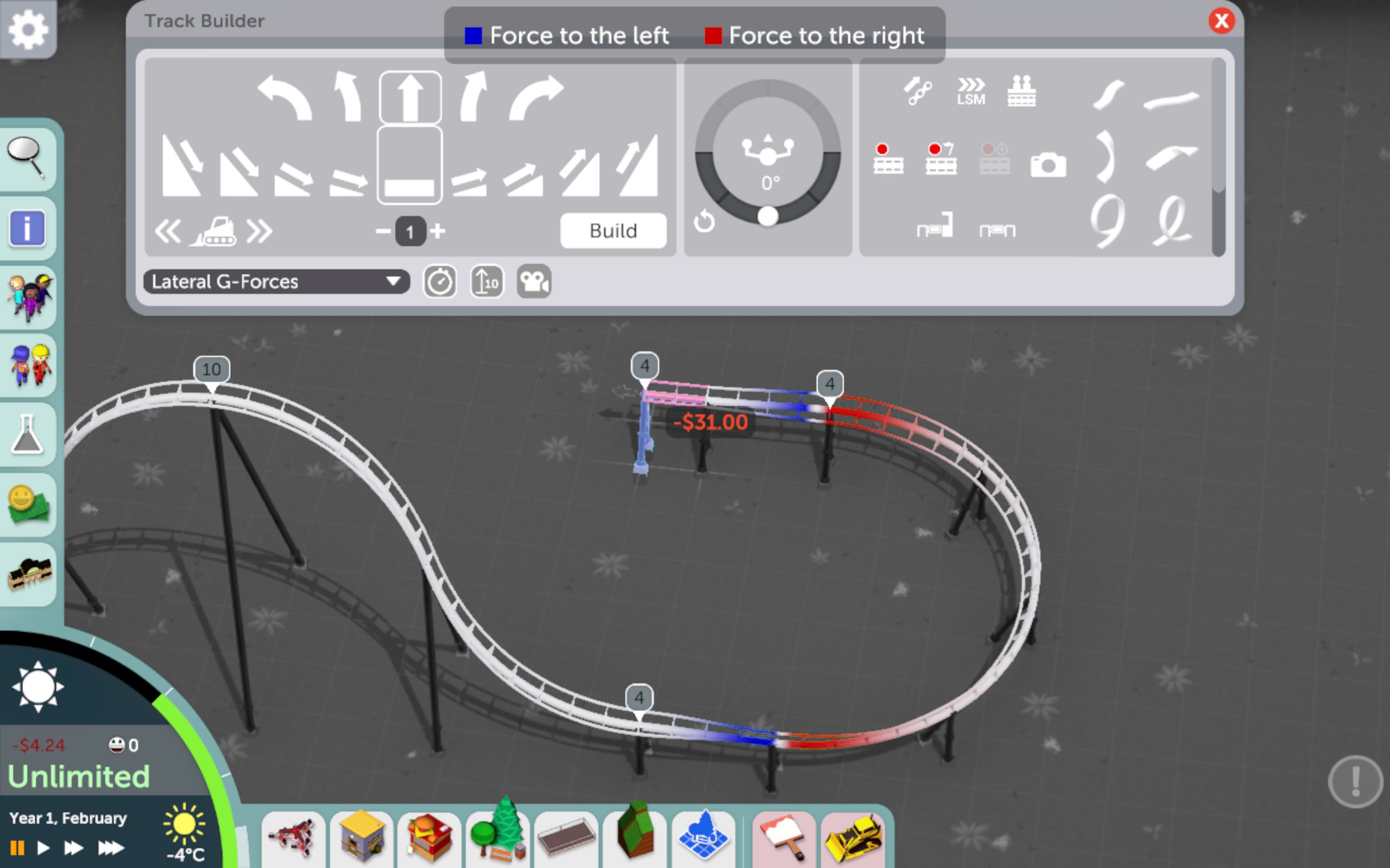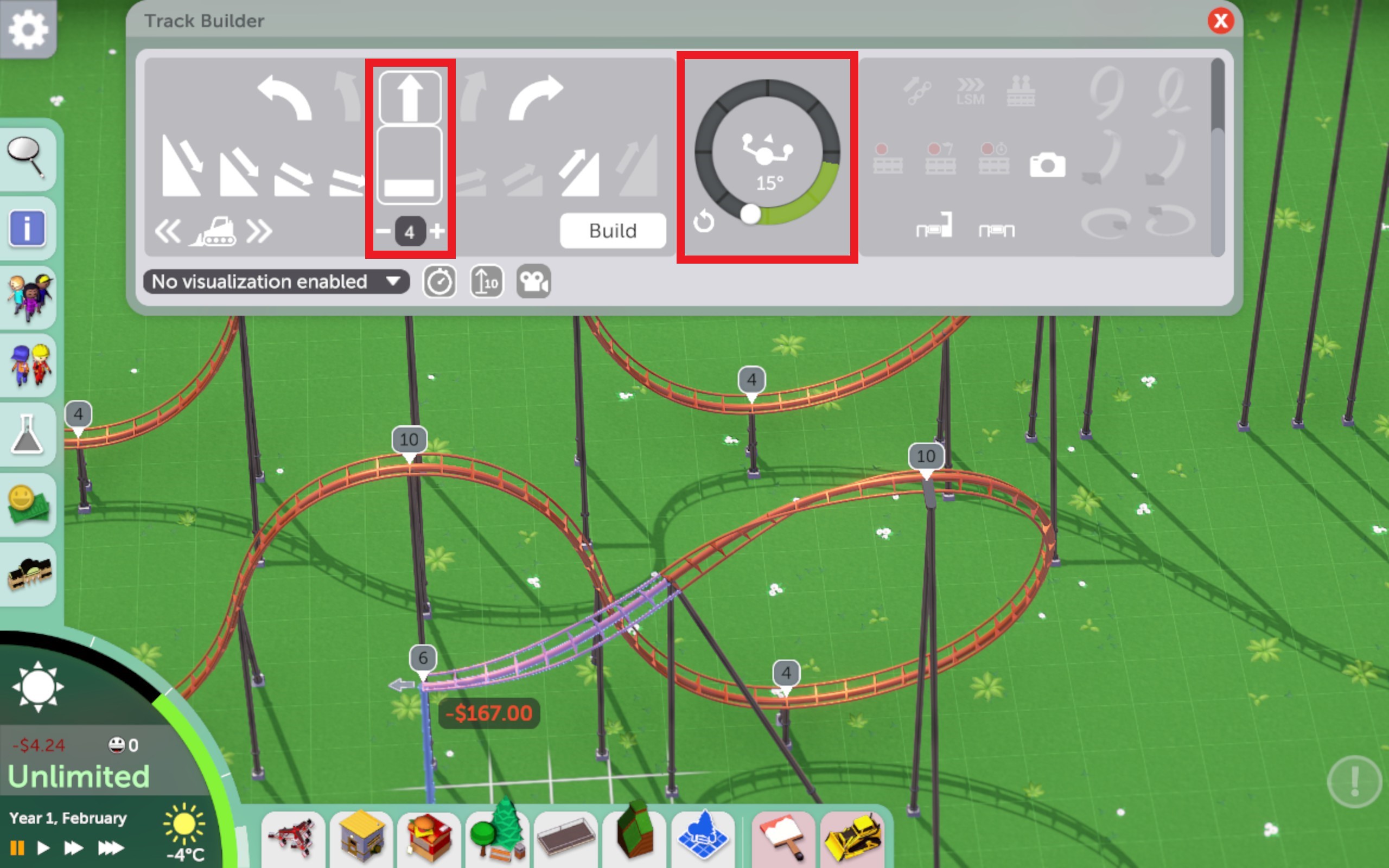 트랙을 기울이는 뱅킹을 적용하기 위해서는 트랙 제작 창의 뱅킹 옵션에서 작은 흰색 원을 원하는 각도로 드래그하면 됩니다. 롤러코스터 타이쿤 시리즈와는 다르게 5도 단위로 뱅킹을 적용할 수 있기 때문에, 측면 가속도를 컨트롤하기가 쉬울 뿐 아니라 트랙을 더 다채롭게 만들 수 있다는 장점도 있습니다.