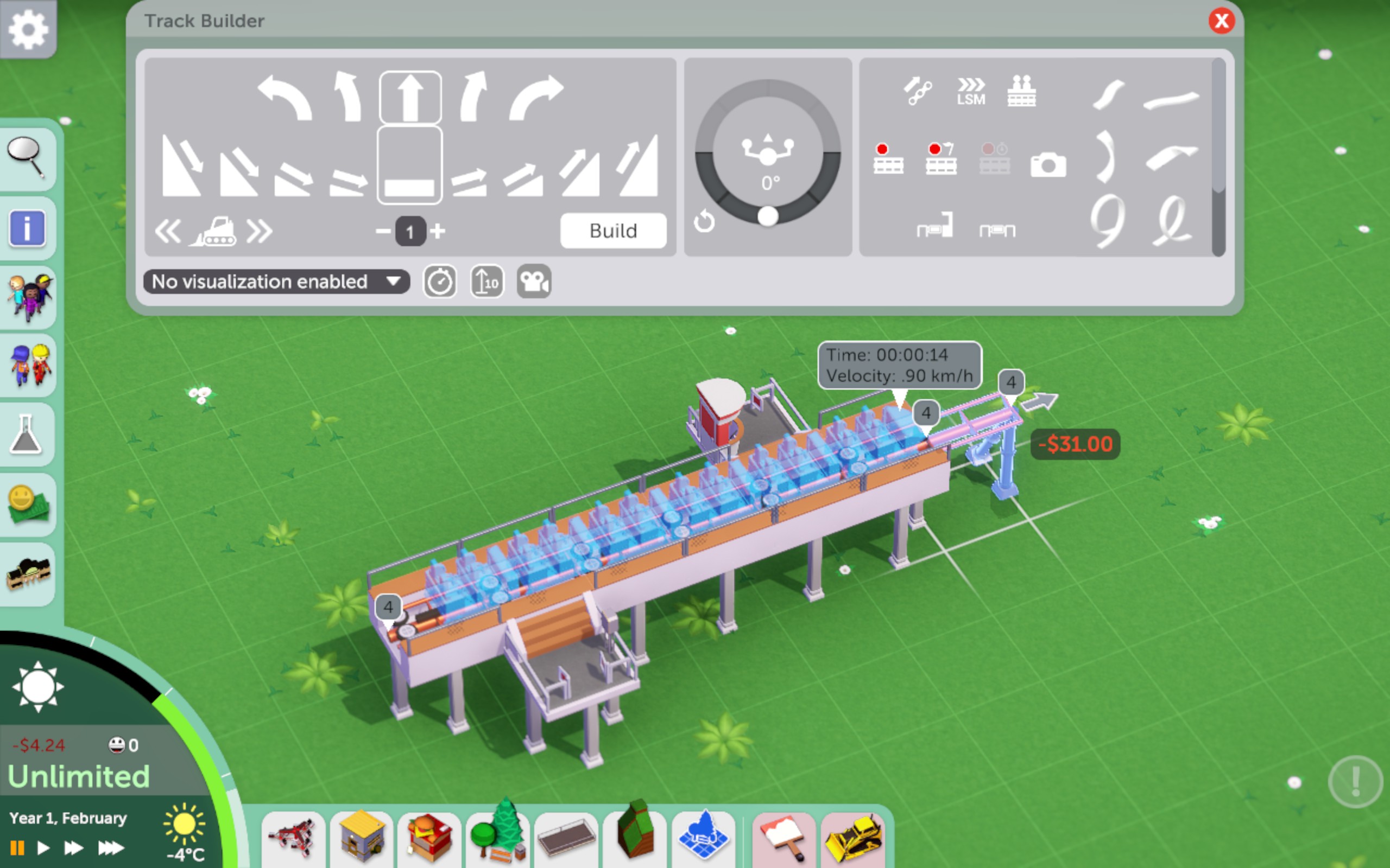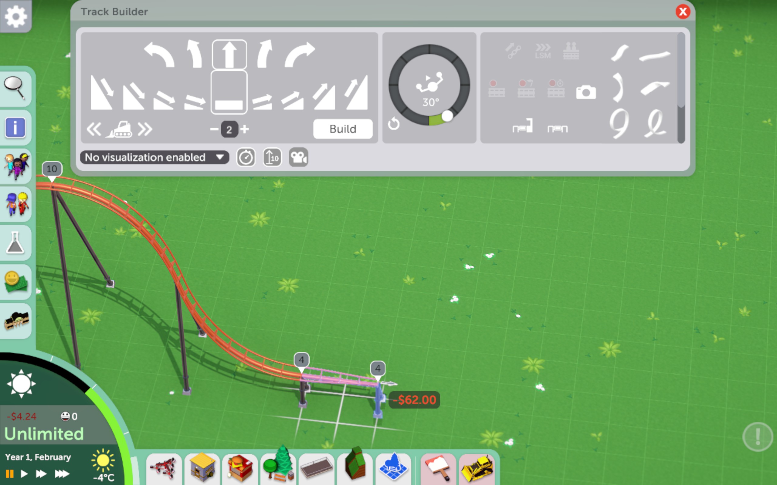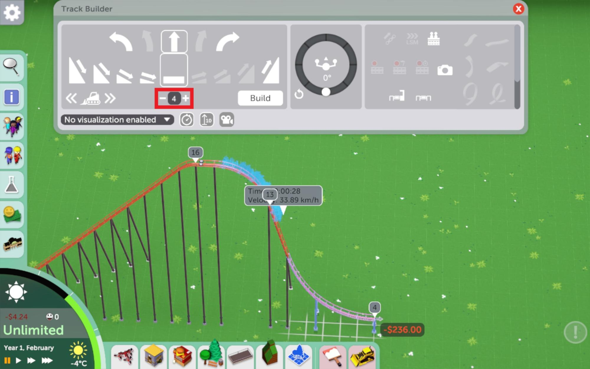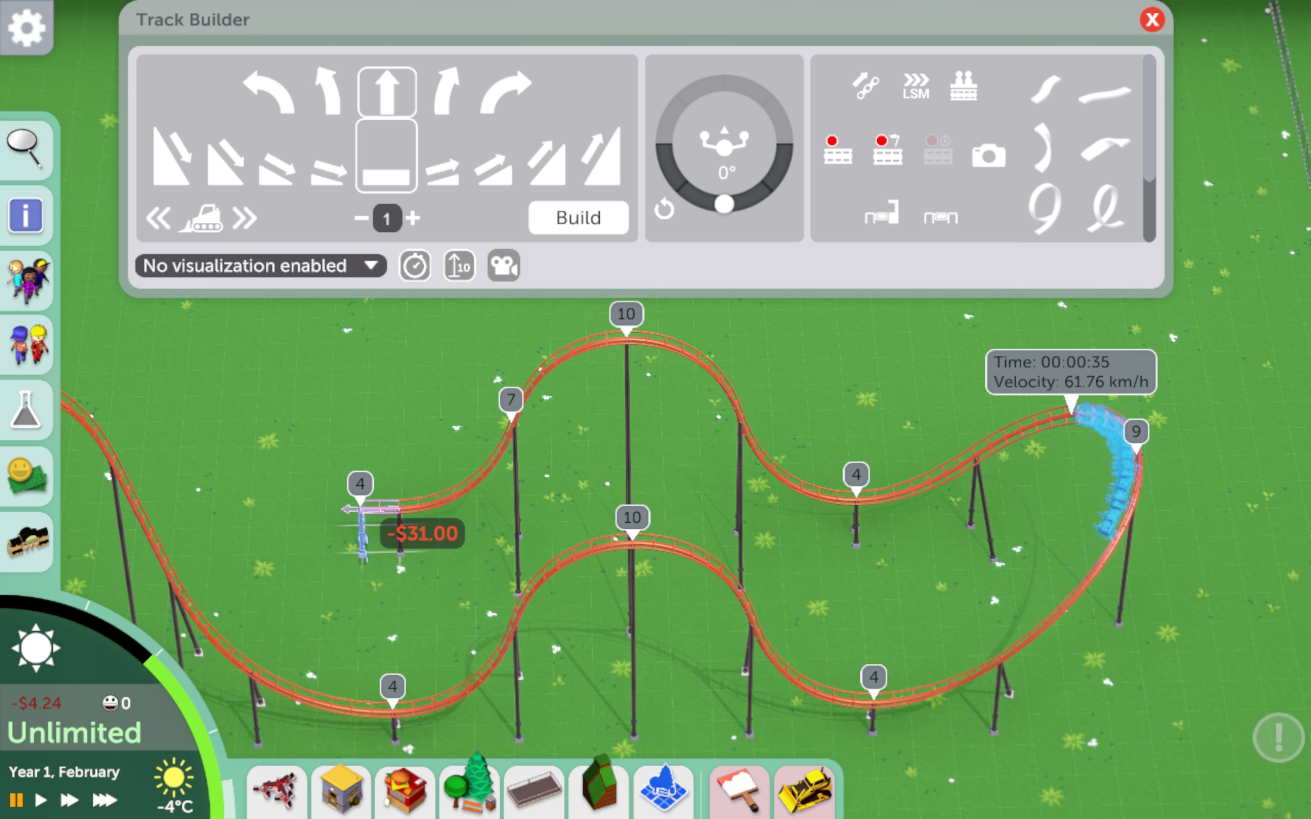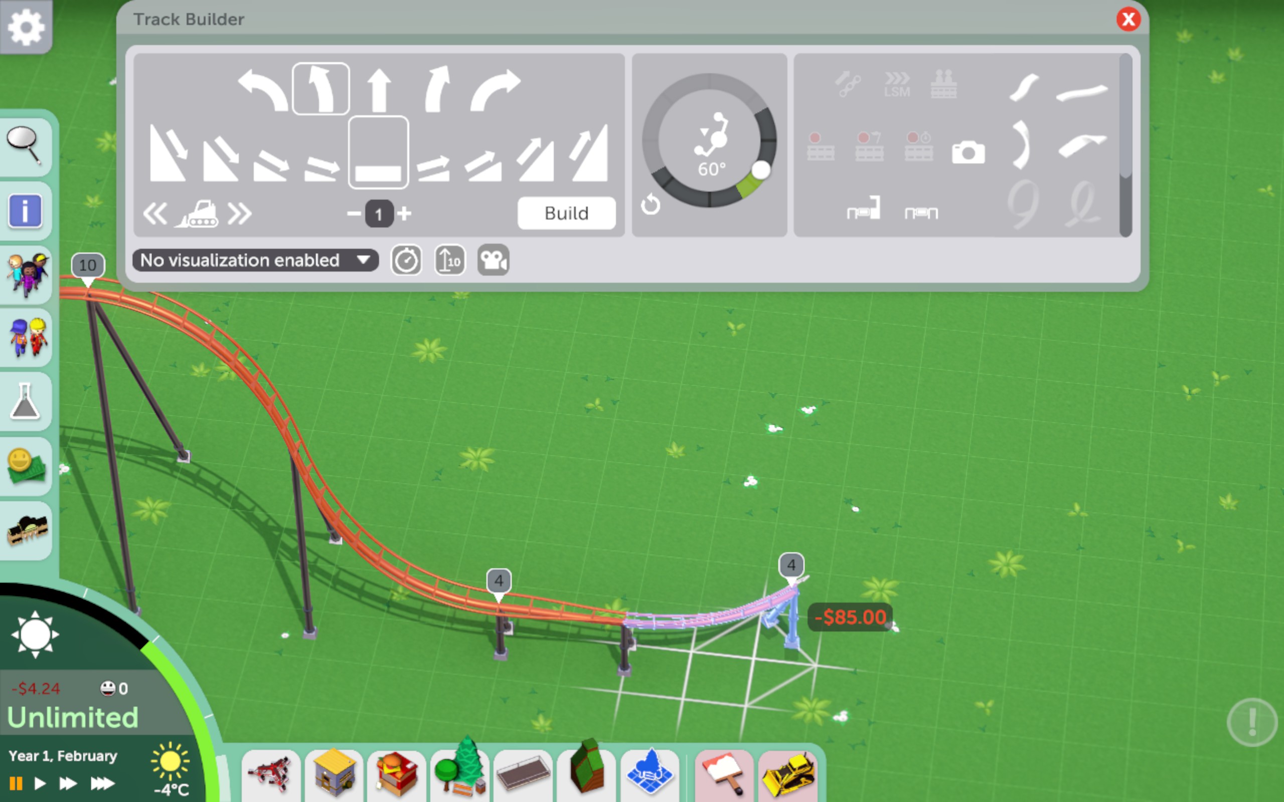 트랙을 기울이는 뱅킹을 적용하기 위해서는 트랙 제작 창의 뱅킹 옵션에서 작은 흰색 원을 원하는 각도로 드래그하면 됩니다. 롤러코스터 타이쿤 시리즈와는 다르게 5도 단위로 뱅킹을 적용할 수 있기 때문에, 측면 가속도를 컨트롤하기가 쉬울 뿐 아니라 트랙을 더 다채롭게 만들 수 있다는 장점도 있습니다.
