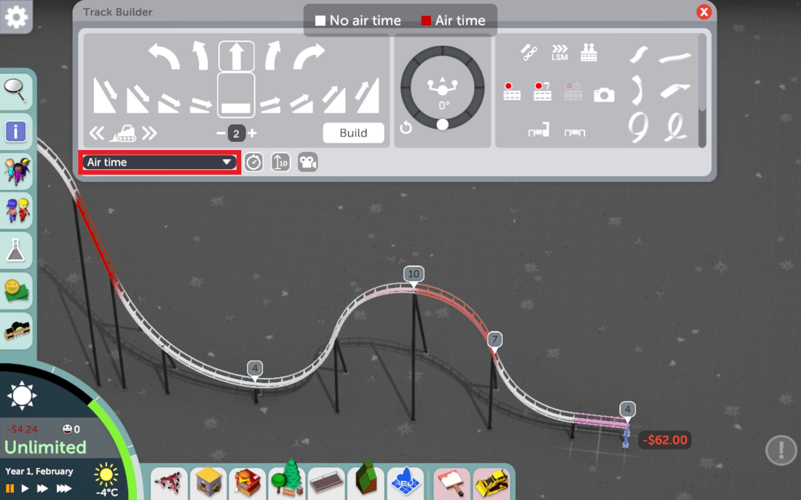 이렇게 하면 언덕 꼭대기 부분에서 에어타임 (air-time - 공중에 붕 뜨는 듯한 느낌) 이 생겨서 롤러코스터의 재미를 더할 수 있습니다. 트랙 건설 창의 왼쪽 아래 시각화 항목들 중에 에어 타임을 선택하면, 트랙의 어느 부분에서 에어타임이 발생하는지를 볼 수 있습니다.