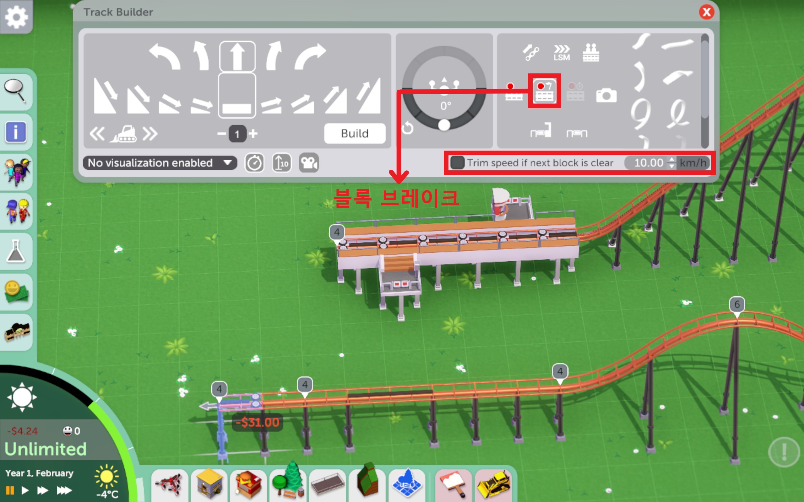 트랙 건설 창의 일반 브레이크를 토글하면, 타겟 속력을 설정할 수 있습니다. 열차가 이보다 빠르게 주행하는 경우 감속시키는 효과가 있습니다. 경험상 2칸 정도 설치하면 충분한 듯 하네요.