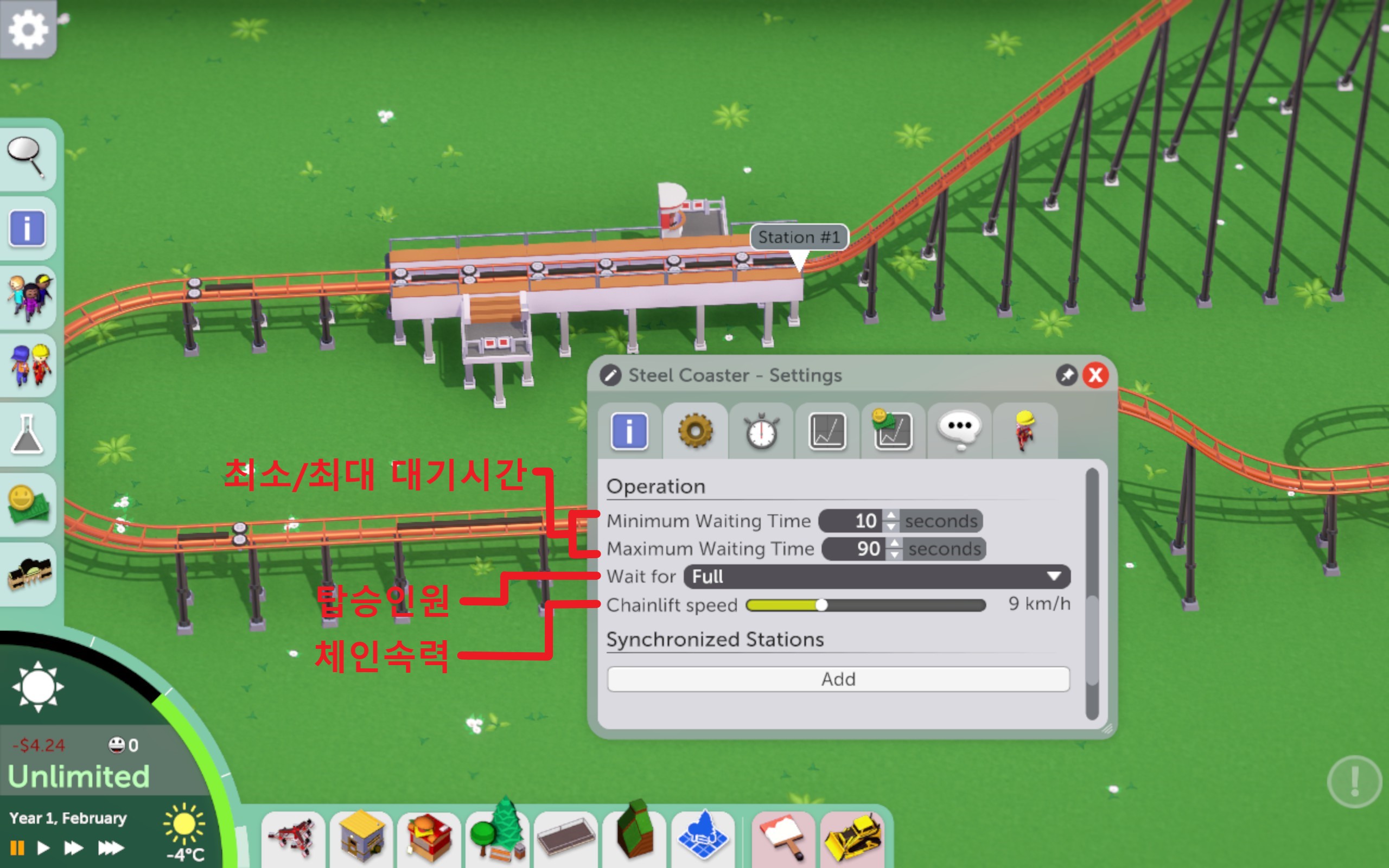 최소/최대 대기시간은 말 그대로 열차가 정거장에서 대기하는 시간의 최소/최대값입니다. 최소 대기시간의 경우 손님들이 열차에 탑승하는 시간에 비해 길지만 않으면, 별로 중요하지 않습니다. 다만 열차가 1대당 1량으로 제한되는 소인승 순환 롤러코스터의 경우 충돌의 가능성이 있으니 0초로 설정하는건 개인적으로 권장하지 않습니다.