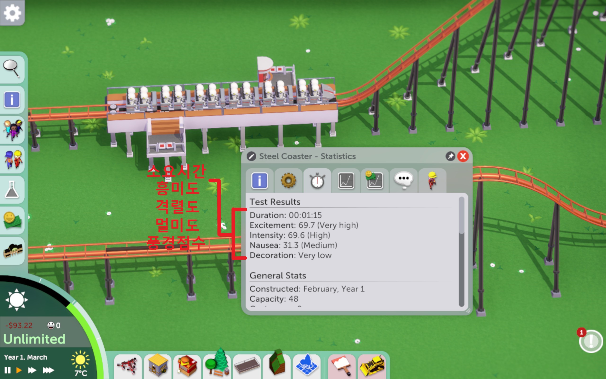 흥미도 65이상인 롤러코스터를 5대 이상 건설하는게 필수 목표인데, 조건을 만족하는 인버팅 우든 롤러코스터가 이미 하나 있기 때문에 실제로 지어야 하는 건 4대입니다. 개인적으로 롤러코스터를 크게 지어서 공원 전체를 누빌 수 있게 하는걸 선호하는데, 그렇게 하니까 후반으로 갈수록 기존 롤러코스터 트랙을 피해가는 게 어려워져서 난이도가 쓸데없이 높아집니다. 지하 터널을 활용해서 흥미도를 높이는 게 더 간단한 방법인듯 하네요.