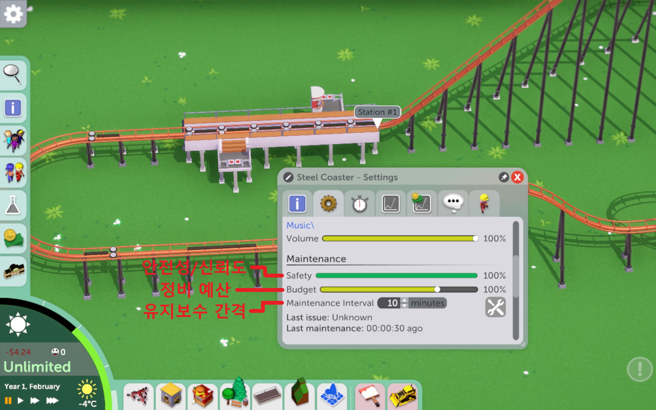 롤러코스터 건설을 마치고 나면, 놀이기구 창에서 톱니바퀴 모양의 탭을 눌러서 운영에 대한 몇가지 설정을 해 줘야 합니다. 맨 먼저 나오는 것은 유지보수 설정으로 정비예산을 25퍼센티지 단위로, 점검 간격을 (실제시간) 5분 단위로 조정할 수 있습니다. 적정한 예산과 점검이 없으면 안전성(신뢰도)가 떨어져 고장이 날 확률이 높아집니다.