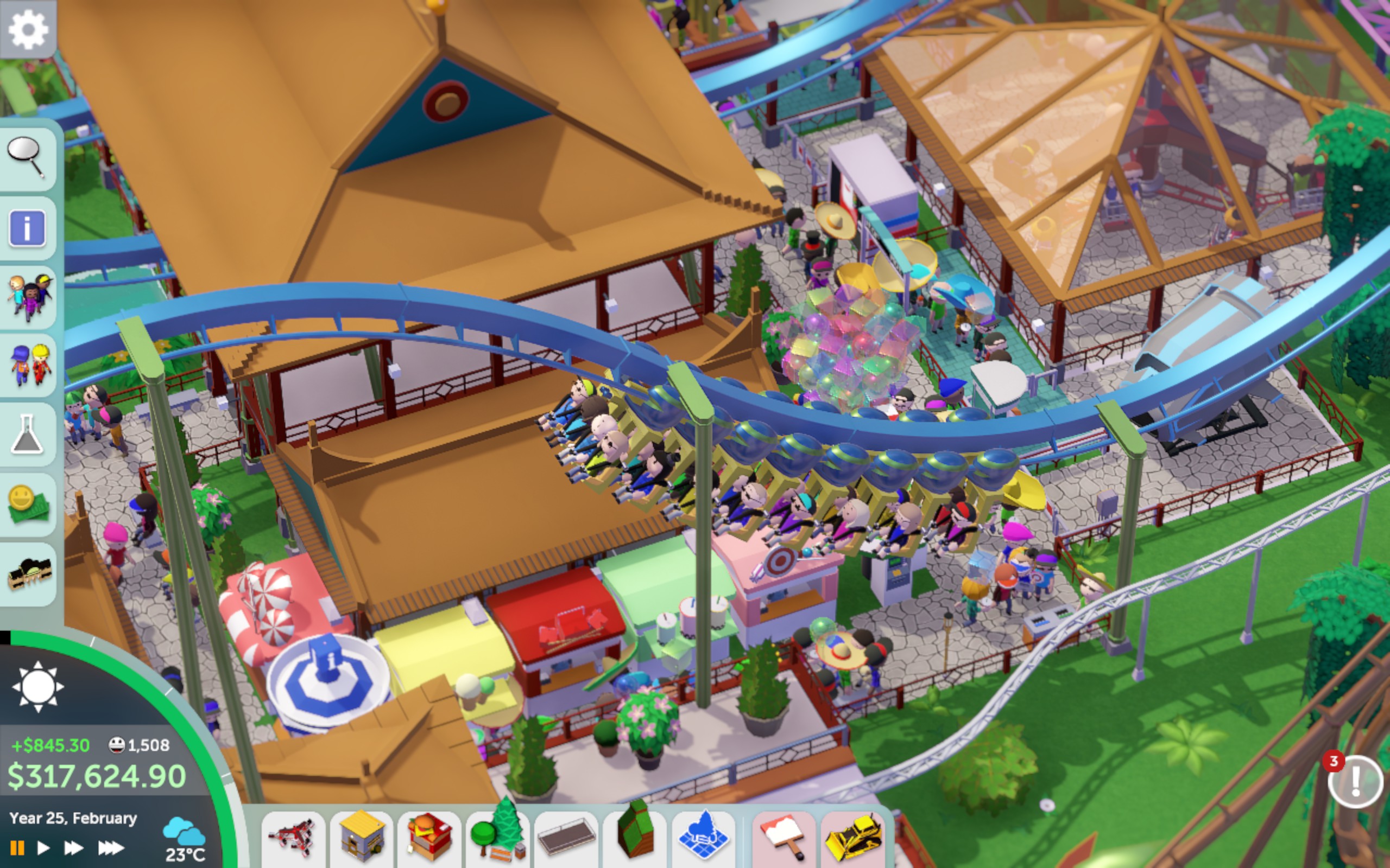 9년만에 새 노트북을 구매한 기념으로 파키텍트를 깔아서 플레이 해 보았습니다. 롤러코스터 타이쿤처럼 놀이공원을 만들고 경영하는 게임인데, 물류시스템과 직원들의 동선을 설계하는 등의