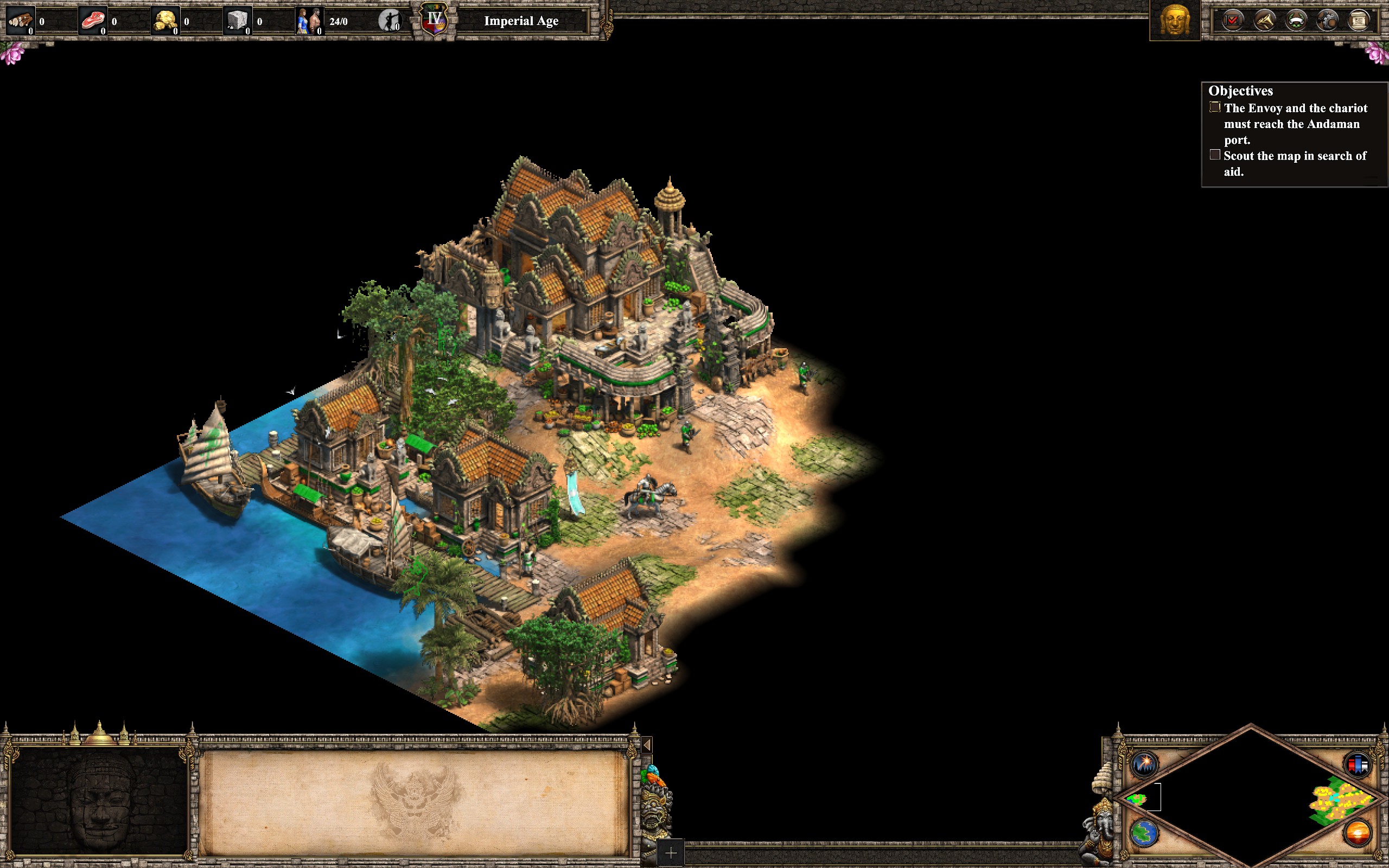 앙코르 왕국의 우다야디티야바르만 1세를 처치하는 미션입니다. 아군 기지는 9시에 위치해 있고, 우호적인 지역주민의 마을이 6시 방향에 있습니다. 그곳에 시장이 있으니 무역을 통해서 금을 확보하면 좋습니다.
