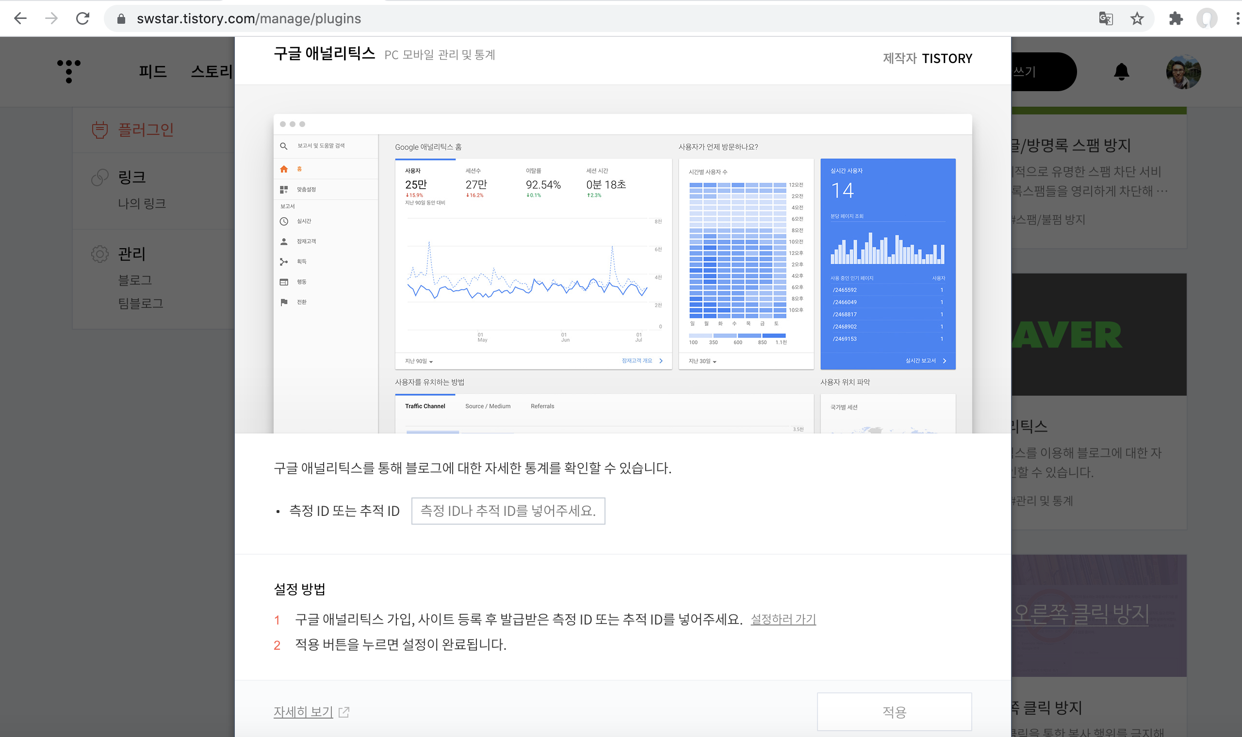 티스토리에서는 사용자의 편의를 위해서 별도의 구글 애널리틱스 플러그인을 제공하는데요. 애널리틱스 계정의 추적 ID를 입력하면 블로그와 연동시키는 기능을 가지고 있습니다. 이 때 블로그 스킨 HTML에 애널리틱스 추적코드가 들어가 있는 상태에서 플러그인을 사용할 경우 중복집계가 발생하여 페이지뷰 수가 더블이 됩니다.