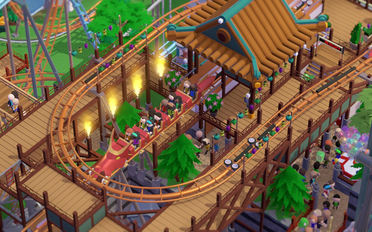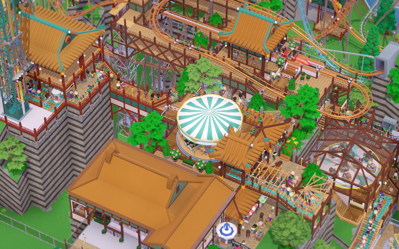 테마에 맞게 중국음식 가게와 버블티 가게를 처음부터 지을 수 있더군요. 놀이기구와 대기줄의 색상은 옥빛으로 맞춰줬습니다. 높이가 낮은 놀이기구의 경우 유리로 지붕을 씌워주면 시야를 가리지 않고도 비와 폭풍우에 면역이 되니까 유용합니다.