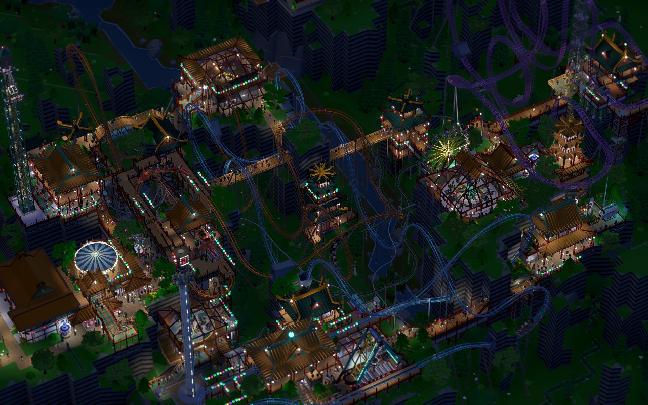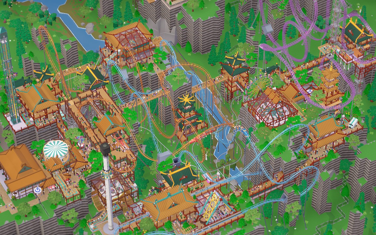 시나리오를 클리어한 뒤에도 공원을 확장하면서 놀이기구들을 추가해 줬습니다. 연구로 개발된 버티컬 드롭 롤러코스터를 공원에서 가장 깊숙한 곳에 지었습니다. 상점가와 직원용 시설을 기와집으로 테밍하고, 트랙 주변에 파고다도 만들어줬더니 무릉도원을 누비는 롤러코스터 같은 컨셉이 만들어지는군요.
